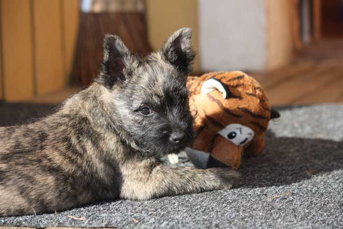 | 1 St Class quality 17 monhts exellent type. head exellent proportions to body. Superactive in ring wiht exellent cairn expressions. Head of clean lines. Should better teeth set in underjaw suitssons set, not in one line. Exellent topline & angulation & tailset. Powerfull movement, but needs better handling to show his super nice temperament. Correct coat texture | ||
