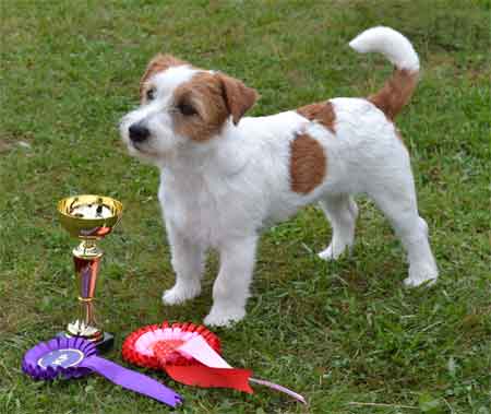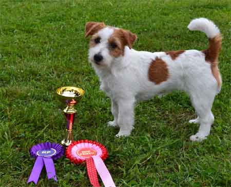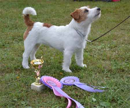 | Feminine. Very good type, needs better shape of skull and stop. Very good propomition of body, needs better croup, short steps | ||