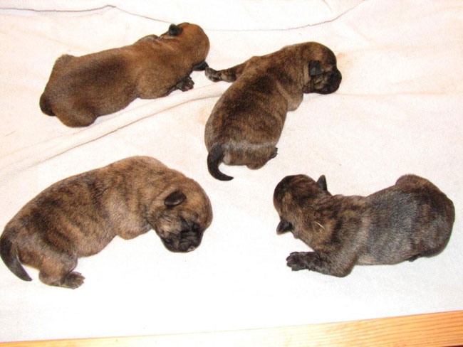 Ensiksi klo 9:46 syntynyt poika sai nimekseen Figo Custavson, painoa Figolla on nyt 670g, klo 10:45 syntynyt toinen poika sai nimeksi Frank Custavson ja se painaa nyt 665g, ensimmäinen narttu syntyi 11:57 ja sille annettiin nimi Fröken Friidu, Friidu painaa nyt 630g ja viimein tyttöpentu joka näki päivän valon klo 13:12. sai kasteessa nimen Fröken Freija ja painaa 650g