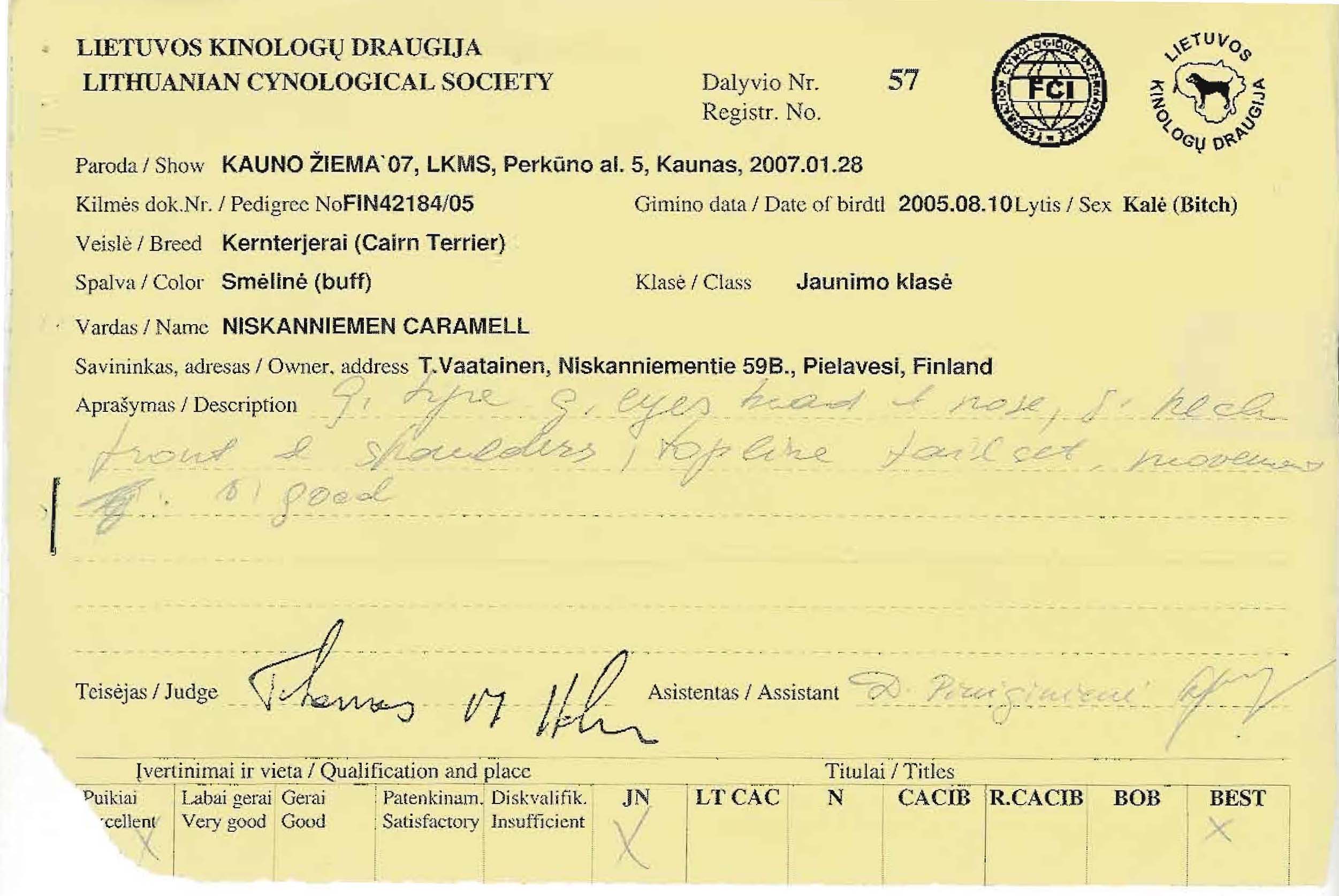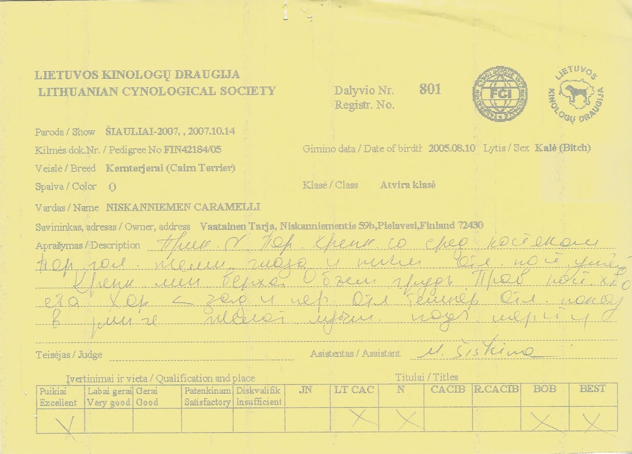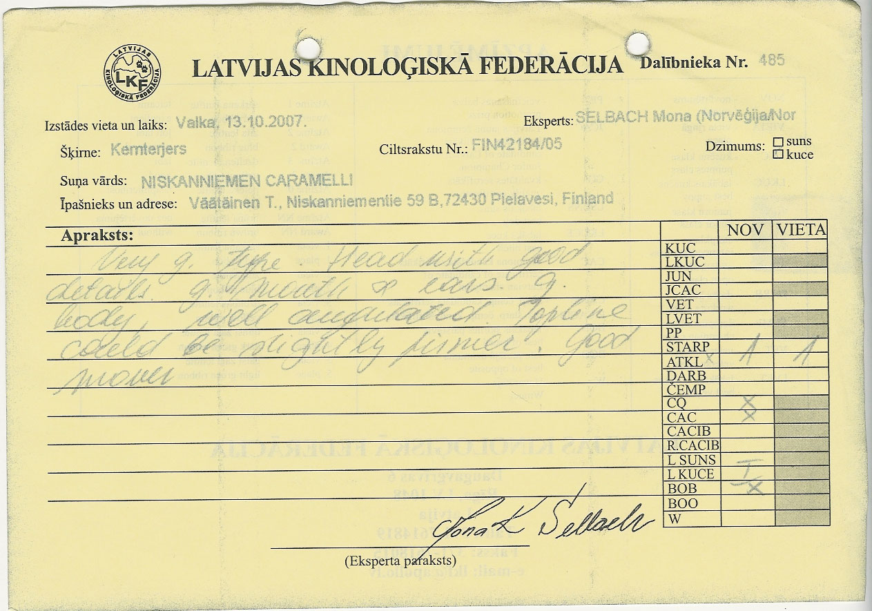 15.03.2008 | Liettua, Vilna terrierien erikoisnäyttely, tuomari Brigita Kremser | ERI, LT CAC, N, BOB, BEST, BEST, CL.W2008 |