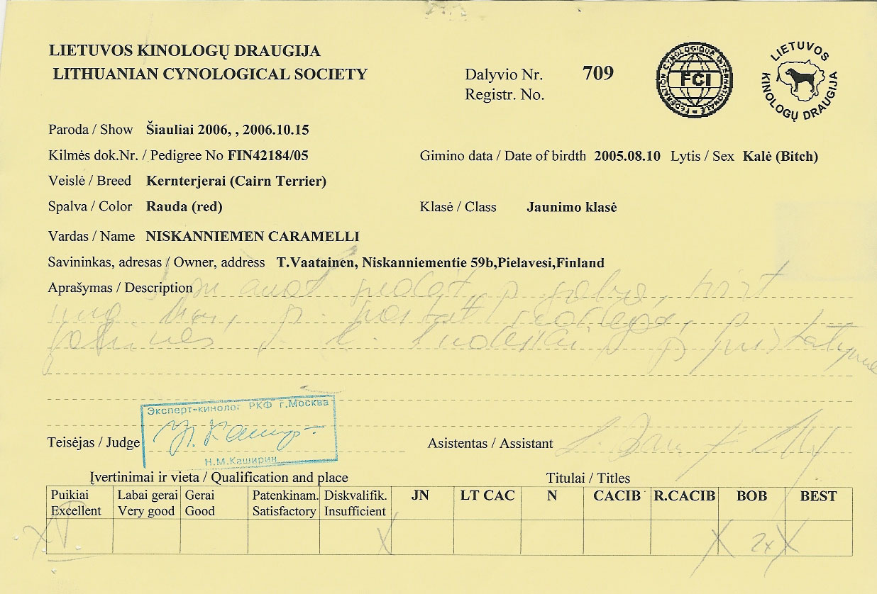 15.10.2006 | Liettua, Siauliai, tuomari Nikolay Kashirin | JUN ERI1 JUNSERT PN1 ROP RYP5 |